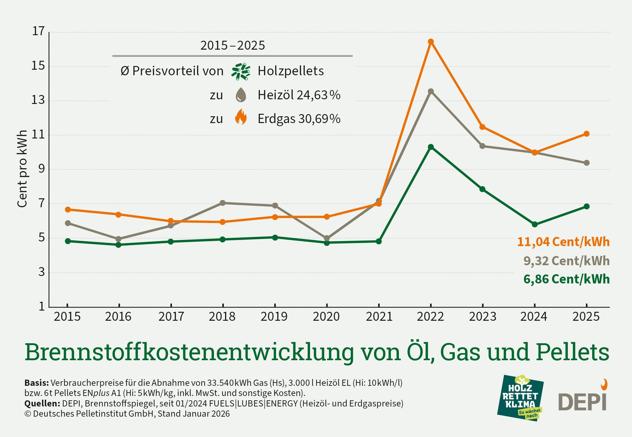 Holzpellets sind nicht vom CO2-Preis betroffen, der fossile Brennstoffe langfristig teurer macht. Im vergangenen Winter zählten Pelletheizungen laut einer Berechnung der unabhängigen Beratung co2online zur günstigsten Heizoption – nach der Wärmepumpe. Gegenüber dem Höchststand während der Energiekrise 2022 lagen die Pelletpreise zuletzt rund 34 Prozent darunter.
